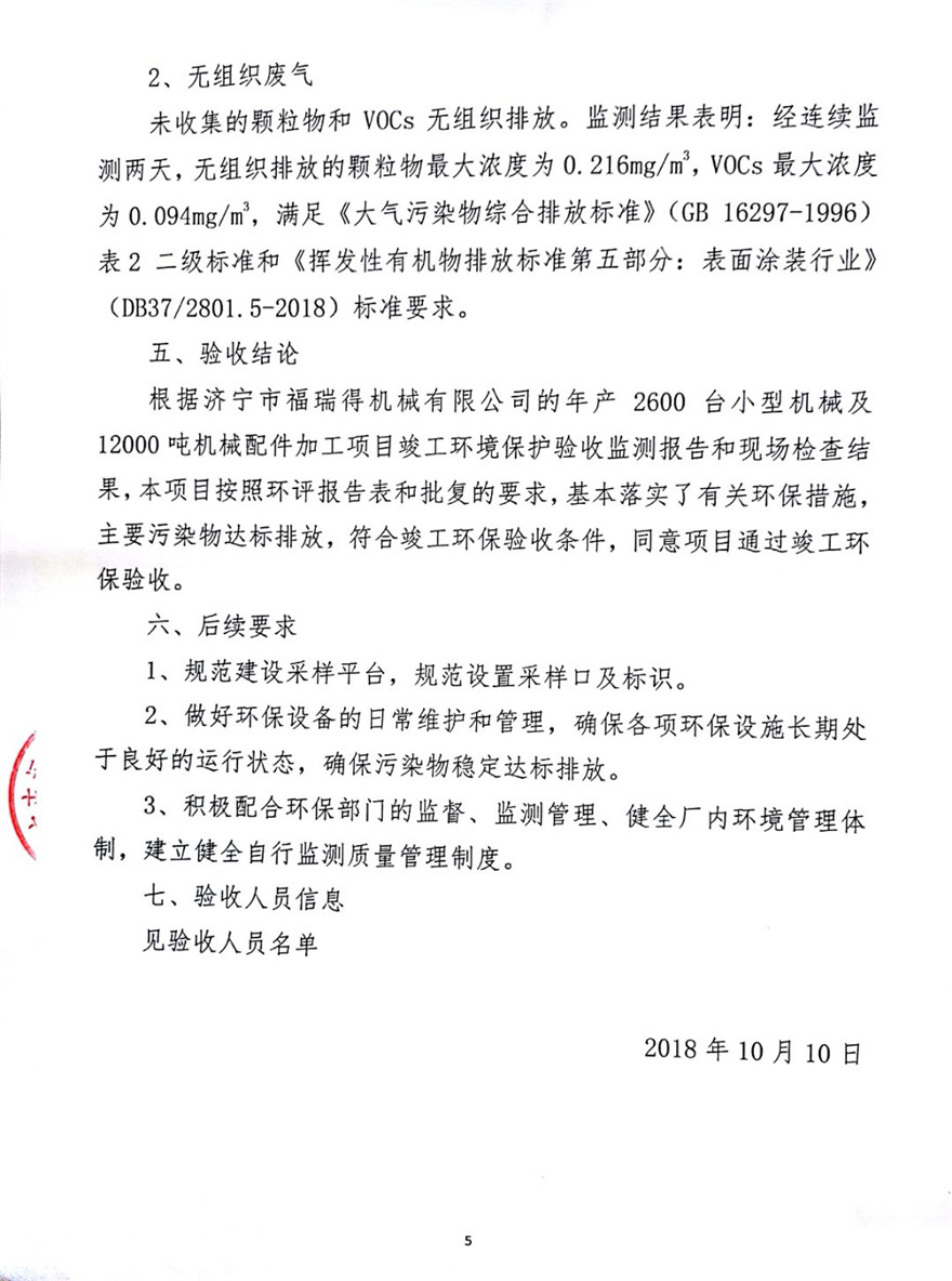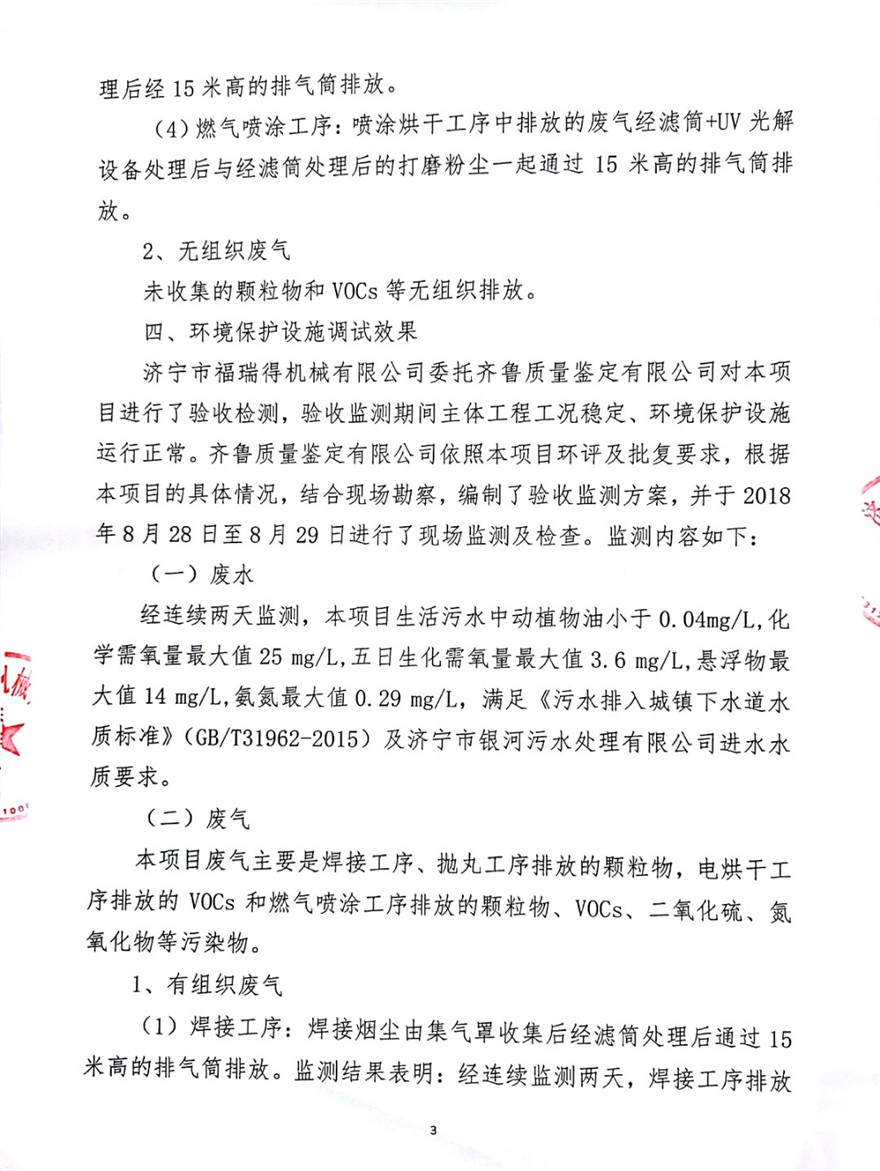 济宁市福瑞得机械有限公司年产2600台小型机械及12000吨机械配件加工项目(废气、废水)竣